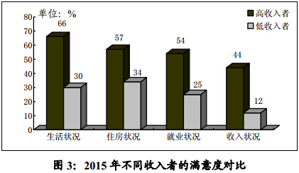 不可忽视的是,与高收入者相比,低收入者对生活状况评价还明显要低,满意度低了36个百分点;对于住房、就业及收入等具体方面,满意度亦低了20个百分点以上(见图3)。
