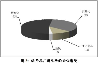 身边治安环境好坏与否,直接影响了市民的生活安心感受。民调显示,超过半数人认为近一年居住地周边盗窃、抢劫等治安问题的治理有改善,比例达57%。治安变好了,市民生活更安心了,表示近年在广州生活“更安心”的人多达52%,表示“没变化”的为35%,表示“更不安心”的人很少,只有11%(见图3)。