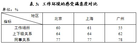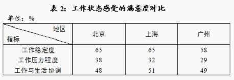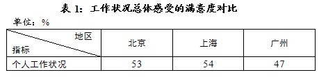 二、工作状况的总体感受,北京、上海较好。广州市民的满意度在三城市中最低,较北京、上海低了6个百分点(见表1)。