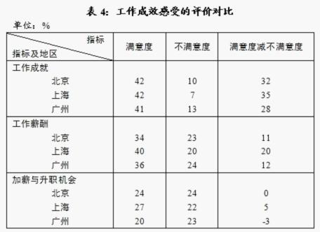 五、工作成效感受,上海市民较好。“工作薪酬”的满意感受,上海比广州高4个百分点,比北京高6个百分点;“加薪与升职机会”上海的满意度高于不满意度5个百分点,北京市民的两者接近,广州市民刚好与上海相反,不满意度高于满意度3个百分点;而“工作成就”的满意水平基本一致(见表4)。
