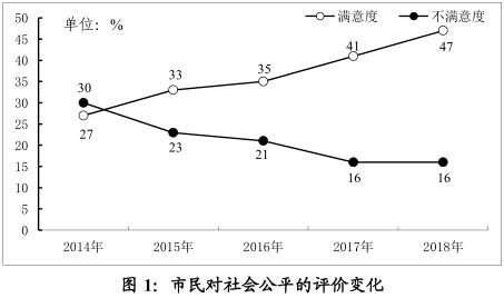 2014年至2018年的民调数据显示,市民对“社会公平”评价发生了质的改善,表示“满意”和“比较满意”的受访者比例(以下简称“满意度”)连续上升20个百分点,由不足三成升至近五成,为47%;同时表示“不满意”和“不太满意”的比例(以下简称“不满意度”)降至16%,明显低于满意度,与2014年不满略高的评价情况截然相反(见图1)。