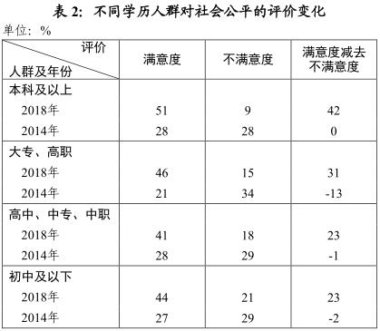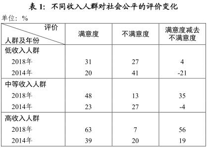 高收入人群评价持续最好,2018年的满意度升达63%的高水平(见表1)。