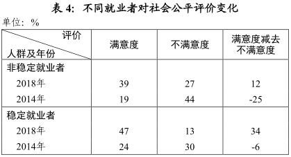 失业、打散工、临时工的非稳定就业者,五年来评价亦有显著变化,满意度明显上升20个百分点,至39%,但对比稳定就业者的47%,还有较大差距,且不满意度接近三成,为27%(见表4)。