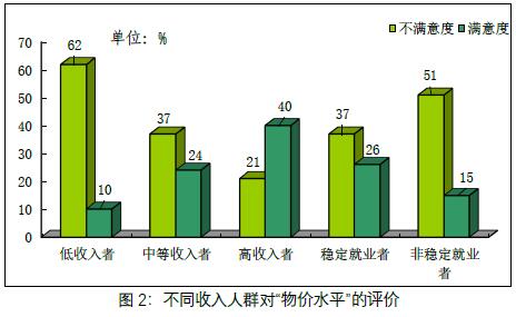早在经济下行压力加大、疫情尚未爆发的2019年底民调已发现,受访市民对“物价水平”的不满意度自2013年持续下降以来出现首次“反弹”,增加近10个百分点至近40%(见图1)。市民对物价水平的不满反弹快、诉求上升大是近年罕见的,物价已然成为当前高度敏感民生问题。进一步分析发现,低收入者和非稳定就业者对物价不满最为突出,其中低收入人群的不满意度高达62%,满意度仅为10%;非稳定就业者的不满意度亦达51%(见图2)。