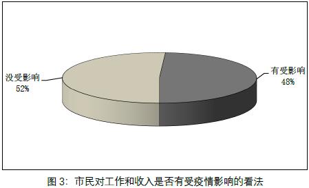 进入2020年,疫情对市民经济生活的影响面甚广。2020年5月最新民调显示,近五成受访市民明确表示工作和个人收入受到疫情影响,比例达48%(见图3),主要表现为工作时间缩短、只发部分工资、放无薪假等等。而且多至60%的受访市民表示今年以来家庭收入下降,对收入预期亦较悲观,有36%的人认为未来半年家庭收入将下降。疫情对市民经济生活影响严峻背景下,市民对物价水平不满情绪难免更高涨。