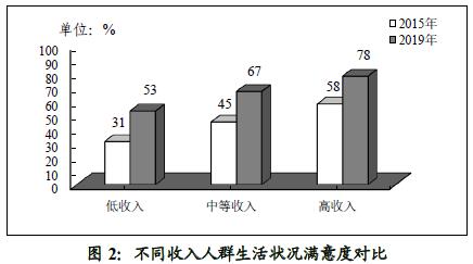 在不同收入水平的人群中,高收入人群对生活状况的满意度最高,满意度在2019年升至78%,较2015年上升了20个百分点(见图2)。中等收入人群与低收入人群对生活状况的评价均有显著改善。其中,中等收入人群满意度升至67%,较2015年大幅上升22个百分点(见图2)。