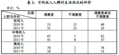 低收入人群的生活状况满意度也超过五成,为53%,相比于2015年31%的满意度有了显著的提升(见图2);而不满意度也有所降低,由21%下降至13%,下降了8个百分点(见表1)。需注意的是,2019年低收入人群的满意度较高收入人群、中等收入人群分别低了14和25个百分点,与2015年相比差距没有缩小。