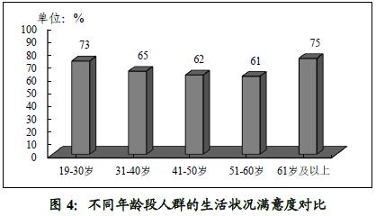 19至30岁的青年人和61岁及以上的老年人,对生活状况的评价最高,满意度分别为73%和75%。其中,19至30岁的青年人满意度较2015年上升27个百分点,上升显著。而中青年人(31至40岁)、中年人(41至50岁)和中老年人(51至60岁)的满意度则分别为65%、62%和61%,评价明显低于青年人和老年人(见图4)。