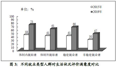 数据显示,近五年来不同就业类型人群的生活状况满意度均有显著上升。其中,稳定就业者的生活状况满意度在2015-2019年间由41%升至66%;而打临时工钟点工的非稳定就业者,满意度由30%升至47%,两者间差距由11个百分点扩大至19个百分点。