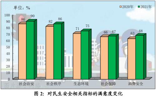 近年社会环境整体改善,社会秩序、社会治安、生态环境和消费安全等民生安全相关指标,市民满意度与2020年相比均上升了5个百分点左右,其中社会秩序和社会治安升至86%和90%,生态环境和消费安全升至75%和68%。社会保障的满意度也有67%(见图2)。市民对物价水平的不满趋缓,不满意度降至22%,满意度升至42%,首次突破四成。