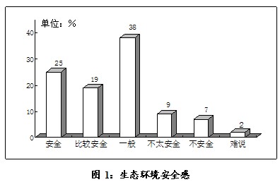 1、市民普遍对生态环境具有安全感。受访市民对生态环境的安全感为82%。其中“安全”、“比较安全”的比例合计为44%,远高出不安全比例28个百分点(见图1)。