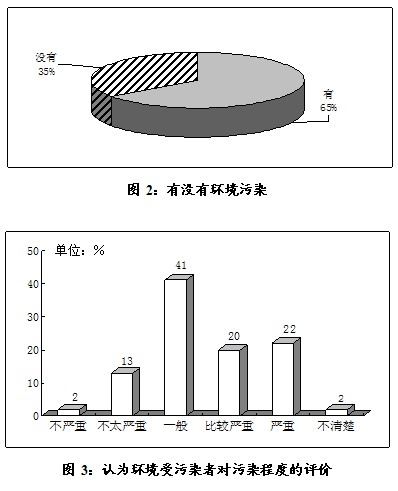 2、多数人认为环境受污染,且污染程度较高。65%的市民表示生态环境受到污染(见图2),其中对污染程度认为严重的比例超过四成,远超不严重比例27个百分点;明确表示“严重”的就有22%(见图3)。