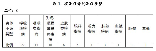 在有不适者中,不适情况最多的是呼吸道疾病,被选比例过两成;其次是咽喉类疾病及失眠、烦躁等精神疾病,被选比例过一成,值得注意(见表1)。