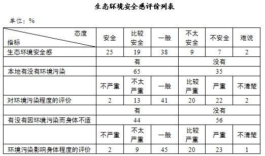 概括来说,虽然市民对目前生态环境具有普遍的安全感,但不少市民认为生态环境受污染较严重,且污染已实实在在影响到市民的健康。