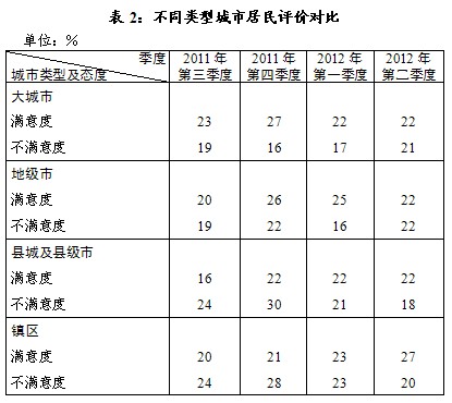 镇区居民的满意度近四个季度以来持续上升,今年第二季度增至27%,高于不满意度,且在各类城市中最高;而大城市、地级市居民的评价基本持平,满意度与不满意度差不多,刚过两成(见表2)。