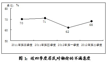 近四个季度以来,受访者对“物价水平”的不满意度一直保持在六成以上,特别是2011年第三、四季度更达七成的甚高水平;虽然2012年第一季度不满下降,但第二季度反弹明显,居民对物价的不满回归到68%,与2011年第三季度的高位基本持平(见图1)。