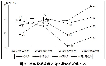 此外,近四季度中,除了低收入人群,其他收入人群不满基本呈现波动中持平的变化,中高及高收入人群的不满甚至下降了12个百分点;且自2012年第一季度起,各收入群体之间的不满差距拉大,呈现收入越低,不满越高的趋势。可见,低收入人群受物价的伤害极深(见图2)。
