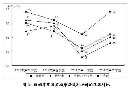城市规模最大的广州、深圳两个大城市的居民,对物价的不满均最高,虽然在2012年第一季度降至近期的低点,但随后的第二季度即大幅增加8个百分点,反弹至74%的高点。反之,地级市、县城及县级市和镇区居民的不满在波动中均有所下降,其中县城及县级市降幅最大,为8个百分点(见图3)。