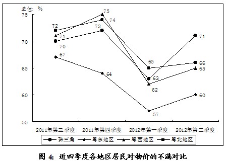 珠三角地区不满极高,虽在2012年第一季度降至63%,但第二季度即大幅增加了8个百分点,不满意度高居各地区榜首;反之,其它地区均在波动中有所下降,2012年第二季度的不满意度均较近期的不满最高点减少了6个百分点以上,其中粤西最为明显,较不满最高的2011年第四季度减少了10个百分点(见图4)。